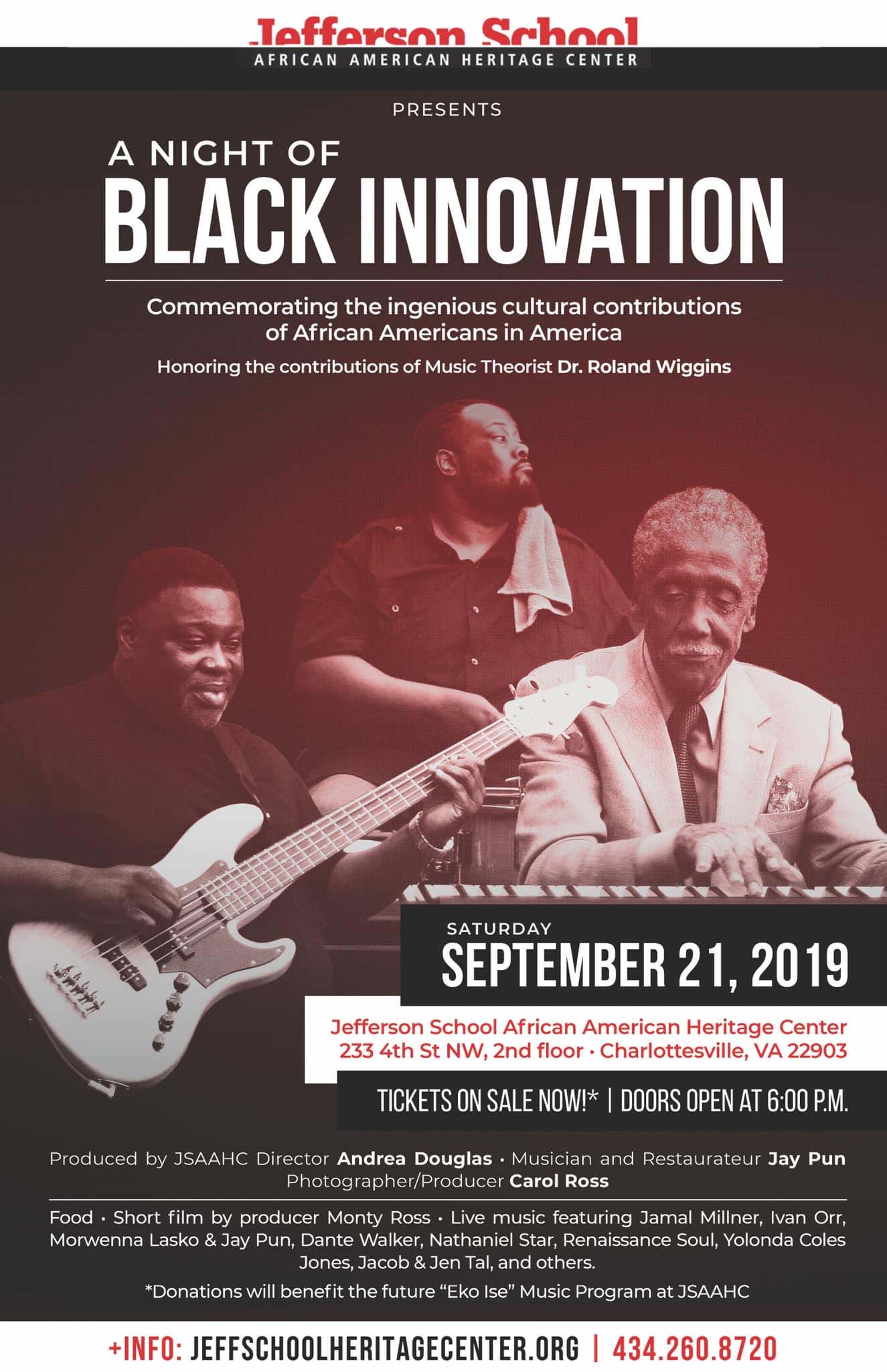 Jefferson School African American Heritage Center (JSAAHC) presents “A Night of Black Innovation”, the first of a series commemorating the ingenious cultural contributions of African Americans in America. “A Night of Black Innovation” kicks off the first event highlighting innovation in Black music on Saturday, September 21. Doors open at 6:00 p.m., at the Jefferson School African American Heritage Center in Charlottesville, VA.