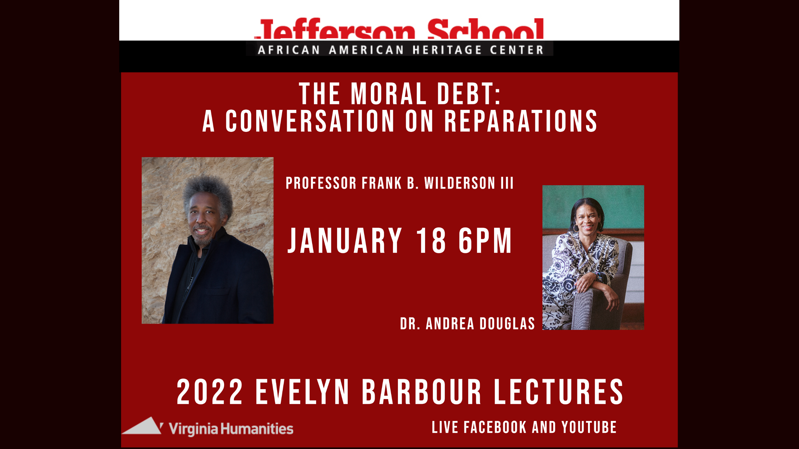 In 2022 the Jefferson School African American Heritage Center will host a series of two-day conversations on the subject of reparations, funded in part by a grant from Virginia Humanities. On the first day a public lecture will be offered by invited speakers who are leading the reparations conversation across the nation. On the second day the Center will host a breakfast conversation for local groups interested in the subject.